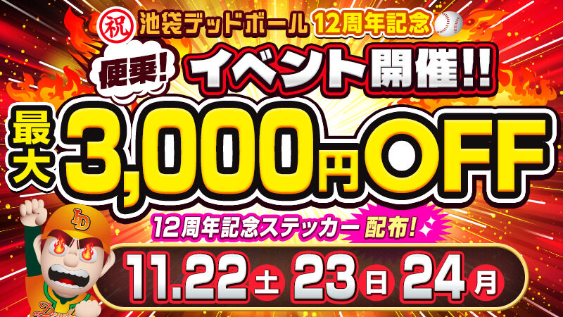 【最大3000円引!&当たり総数100本!ステッカー配布♪】【11/22(土)~11/24(月)】池袋デッドボール12周年記念イベント開催!お得に遊べる3日間お見逃しなく!
